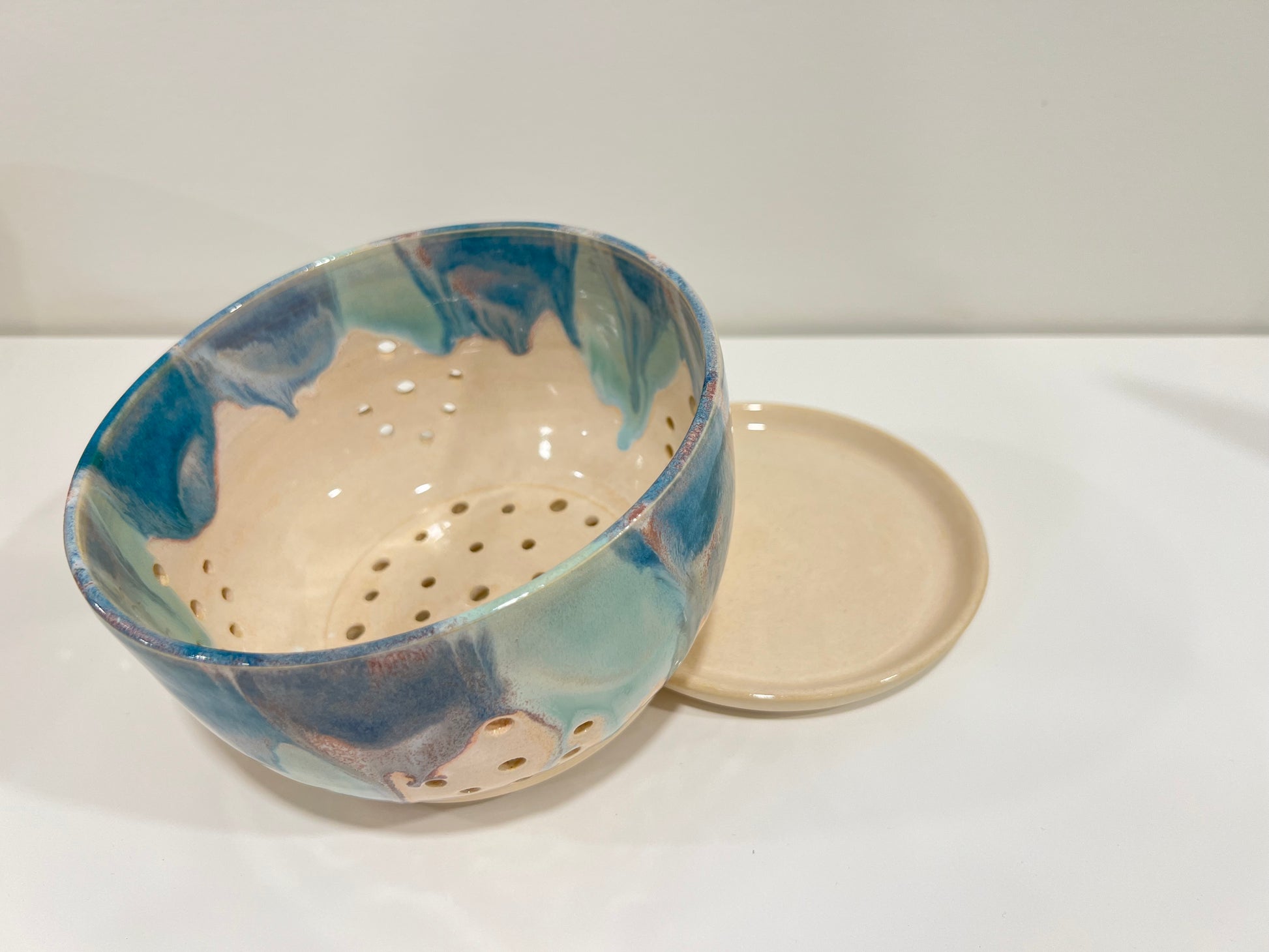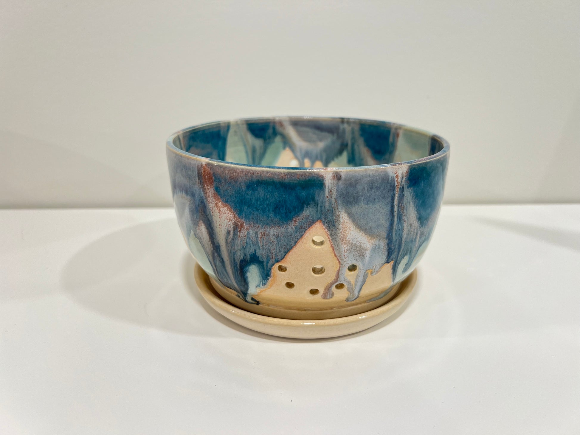 The perfect bowl for rinsing your berries. Comes with a plate for catching water while your berries dry. The bottom of the plate and the bowl are wet sanded for a smooth finish. The berry bowl is 3.5" tall and 6" in diameter. Note that various blue glazes have been hand brushed onto this piece making every side unique.