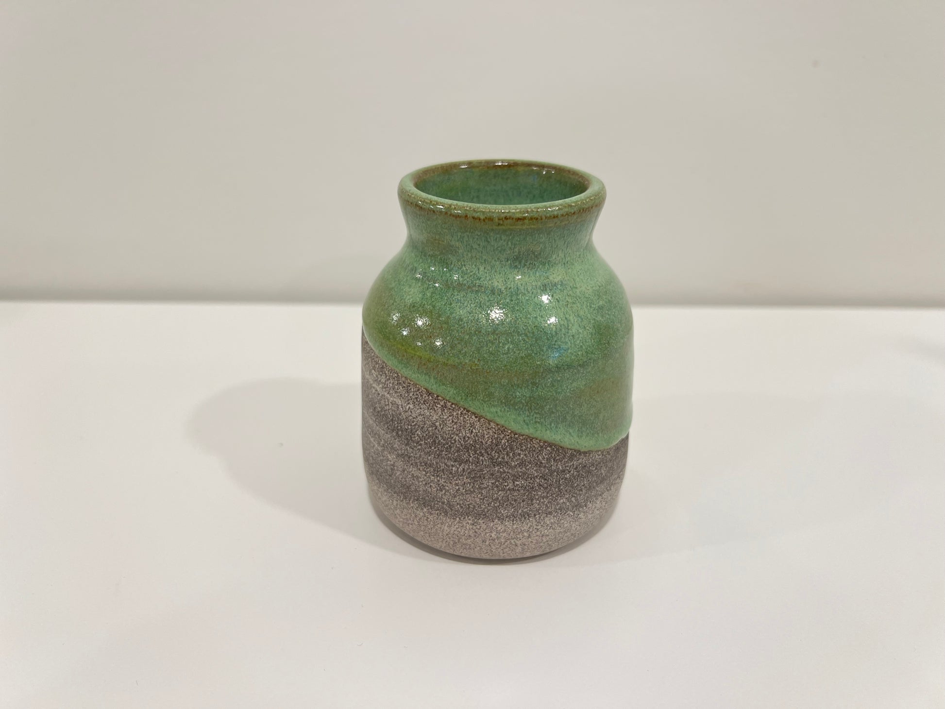 Bud vase. Bottom half of the vase is unglazed to show off the raw dark grey clay. The piece is wet sanded on the bottom for a smooth finish. The vase is 3.5" tall and the mouth of the vase is 1.75" in diameter.
