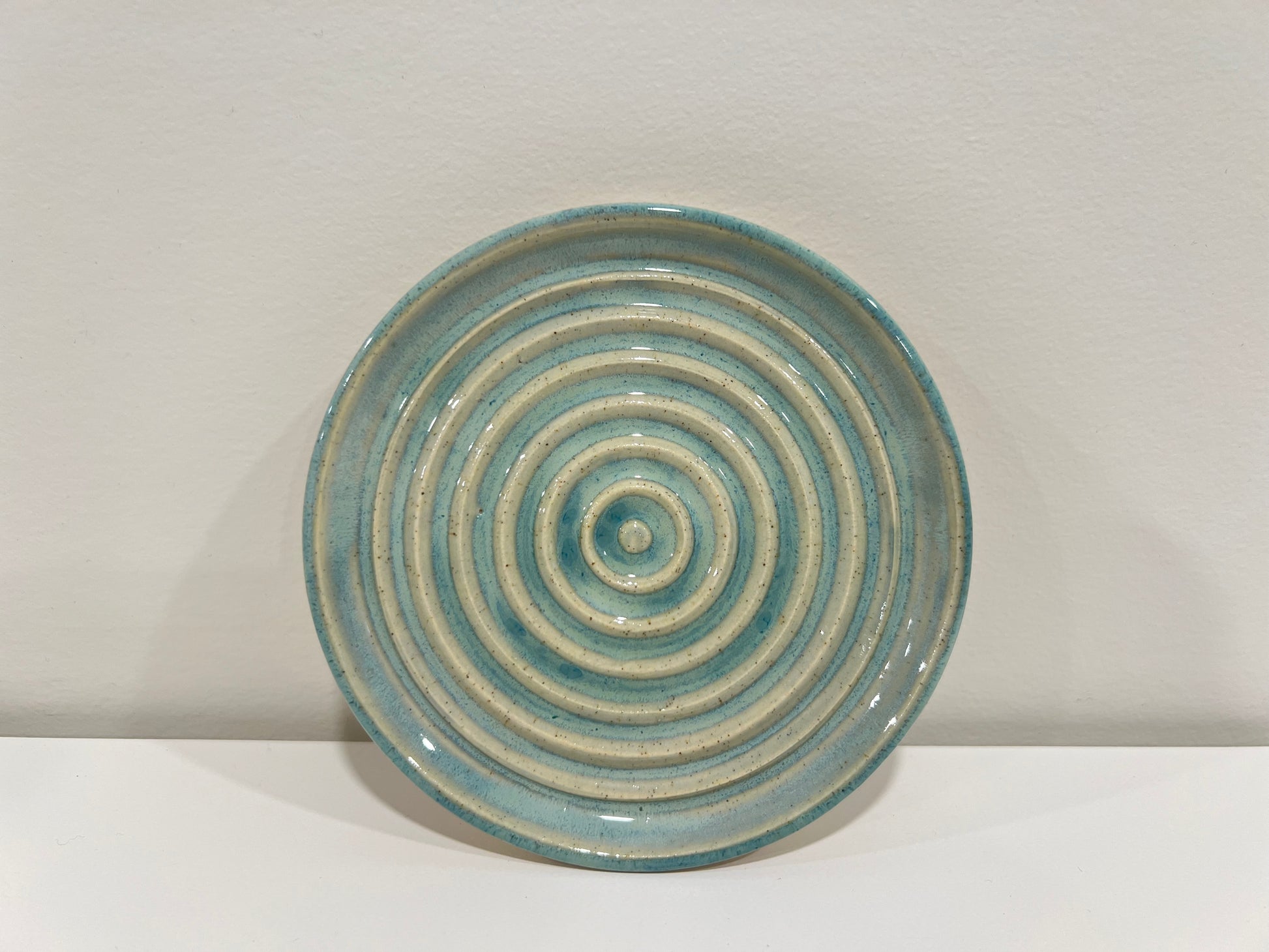 Soap dish with raised grooves to keep you soap dry. The bottom is wet sanded for a smooth finish. The soap dish is 4.75" in diameter.