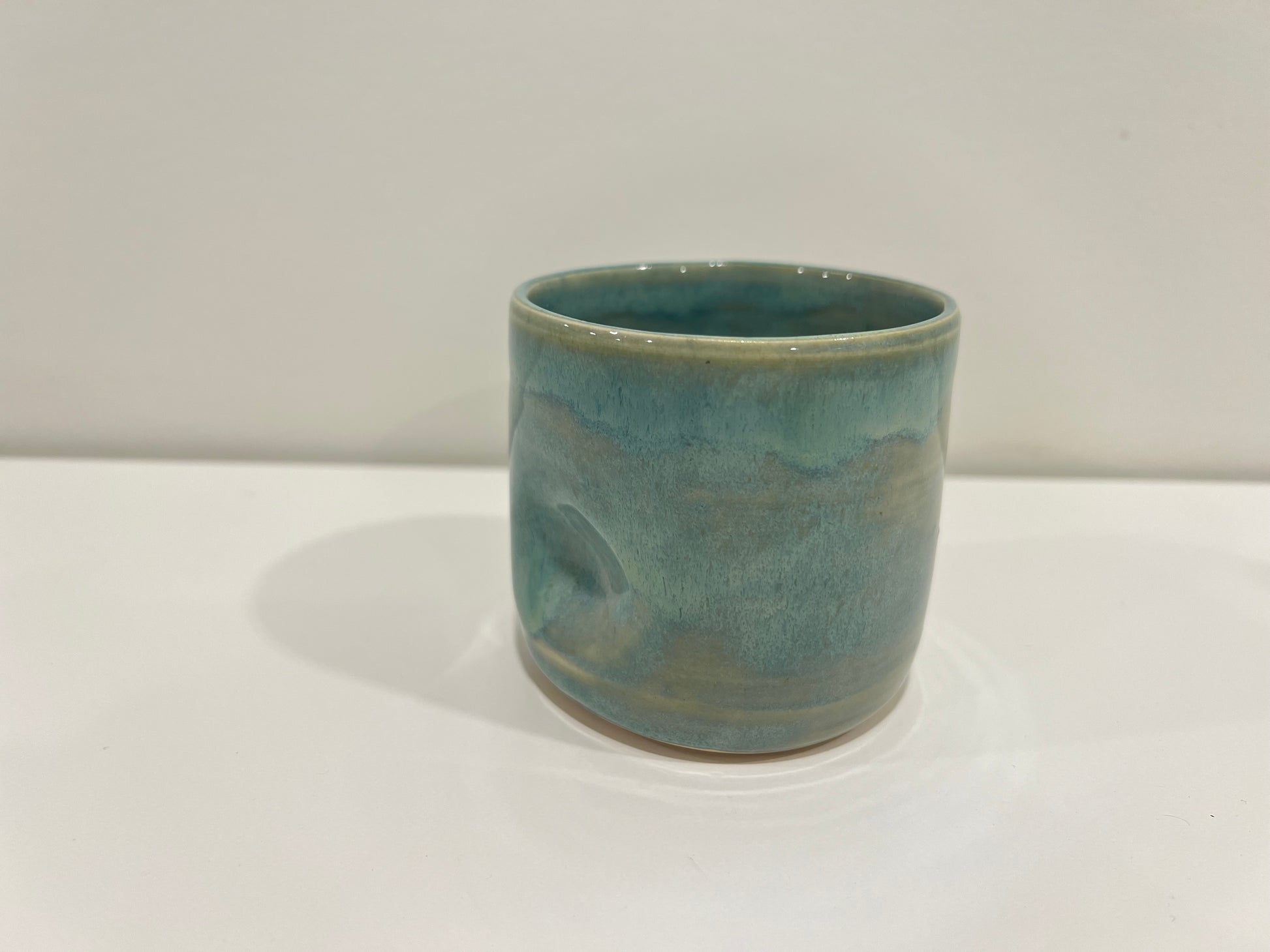 The perfect tumbler for tea, a cappuccino, wine or whiskey. A thumbprint indent allows for easy grip and comfort in the hand. The piece is wet sanded on the bottom for a smooth finish. The tumbler holds 8 oz and is 3" tall and 3" in diameter.